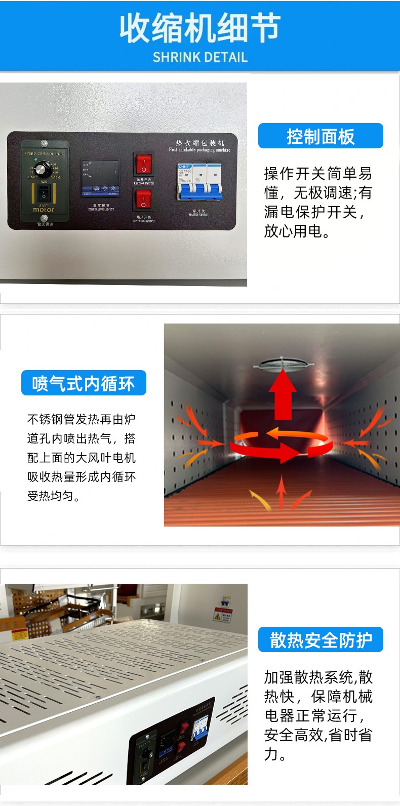 - 熱收縮效果:熱收縮機(jī)的收縮效果直接影響產(chǎn)品的包裝外觀。理想的熱收縮效果是使熱收縮膜緊密貼合產(chǎn)品表面,無褶皺、無破裂。這取決于熱收縮通道的溫度均勻性、風(fēng)速調(diào)節(jié)以及輸送速度的配合等因素。