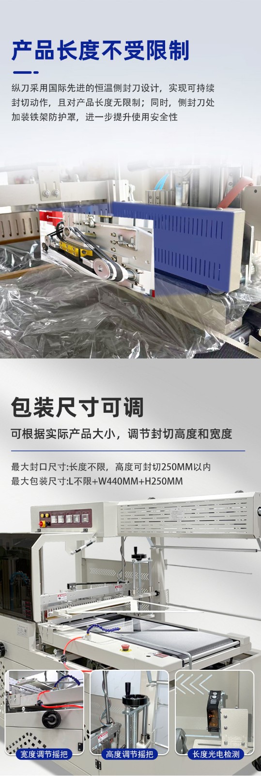其適用范圍廣的核心邏輯是結(jié)構(gòu)兼容性強(qiáng)、薄膜適配性高、尺寸調(diào)節(jié)靈活,能應(yīng)對(duì)不同形態(tài)、尺寸、材質(zhì)的產(chǎn)品包裝需求: