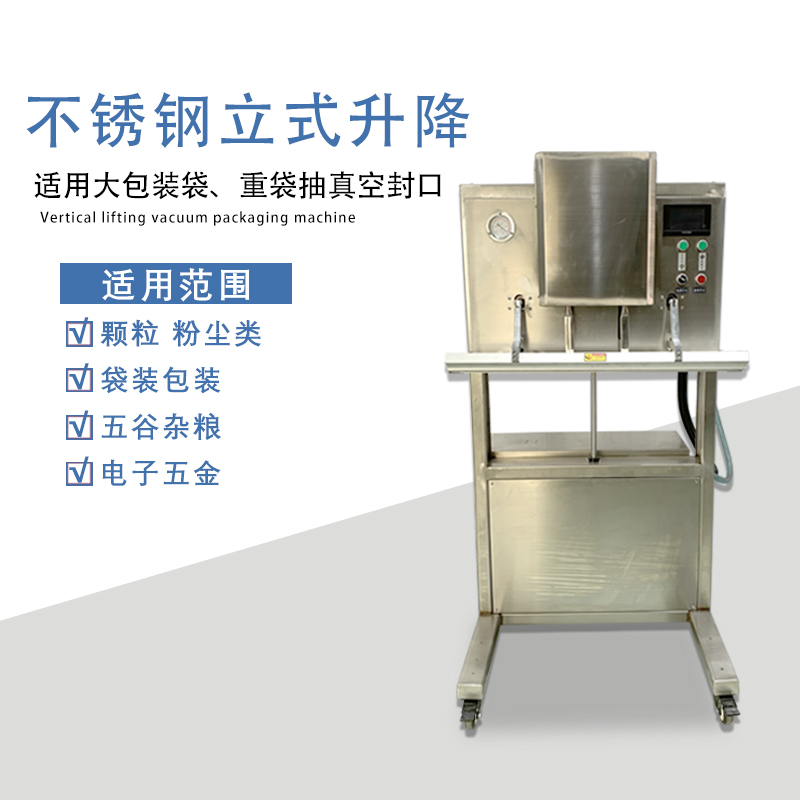 - 立式升降真空包裝機(jī):真空室容積更大,承重能力更強(qiáng)(部分機(jī)型可承重 50kg 以上),能處理大袋顆粒(如飼料、塑膠粒)、大件五金件等普通機(jī)型無法容納的物品。
