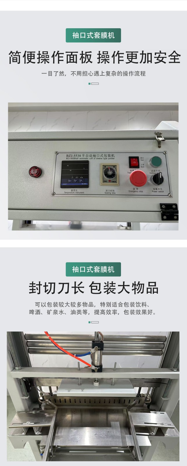 產(chǎn)品經(jīng)輸送帶進入設備后,薄膜被自動套在產(chǎn)品外部,通過電熱絲高溫封切形成袖口狀包裝,隨后進入熱收縮通道,利用高溫使薄膜均勻收縮,緊貼產(chǎn)品表面,完成 “套膜 - 封切 - 熱收縮” 三步包裝流程。