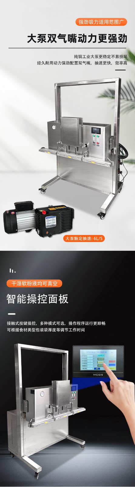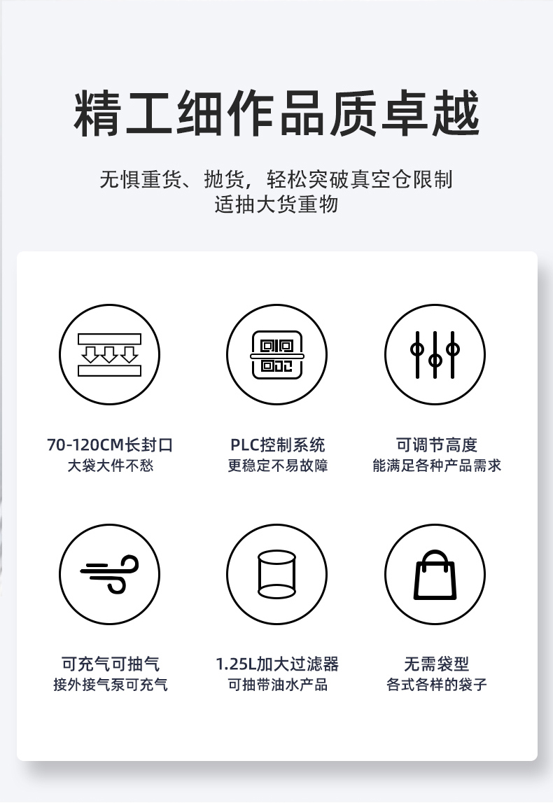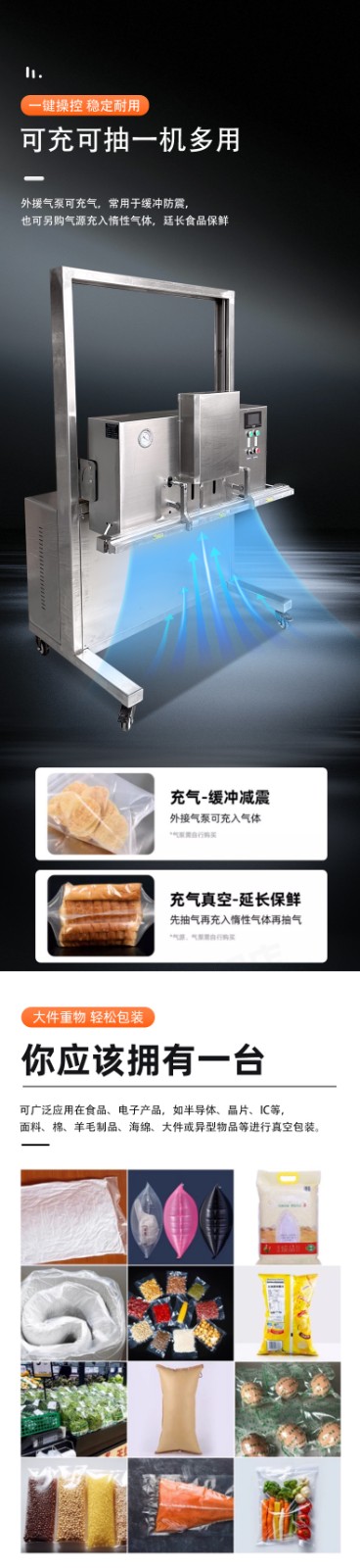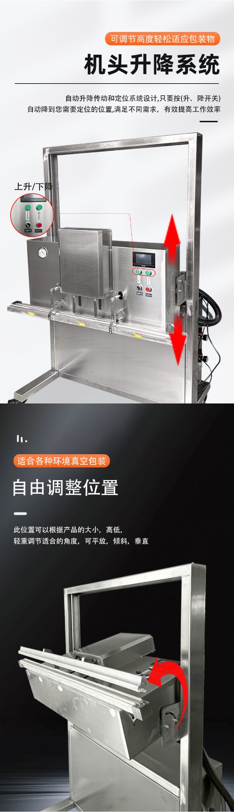 立式升降真空包裝機(jī)滿(mǎn)足大尺寸、重重量、異形產(chǎn)品或多品類(lèi)小批量生產(chǎn)的真空包裝需求