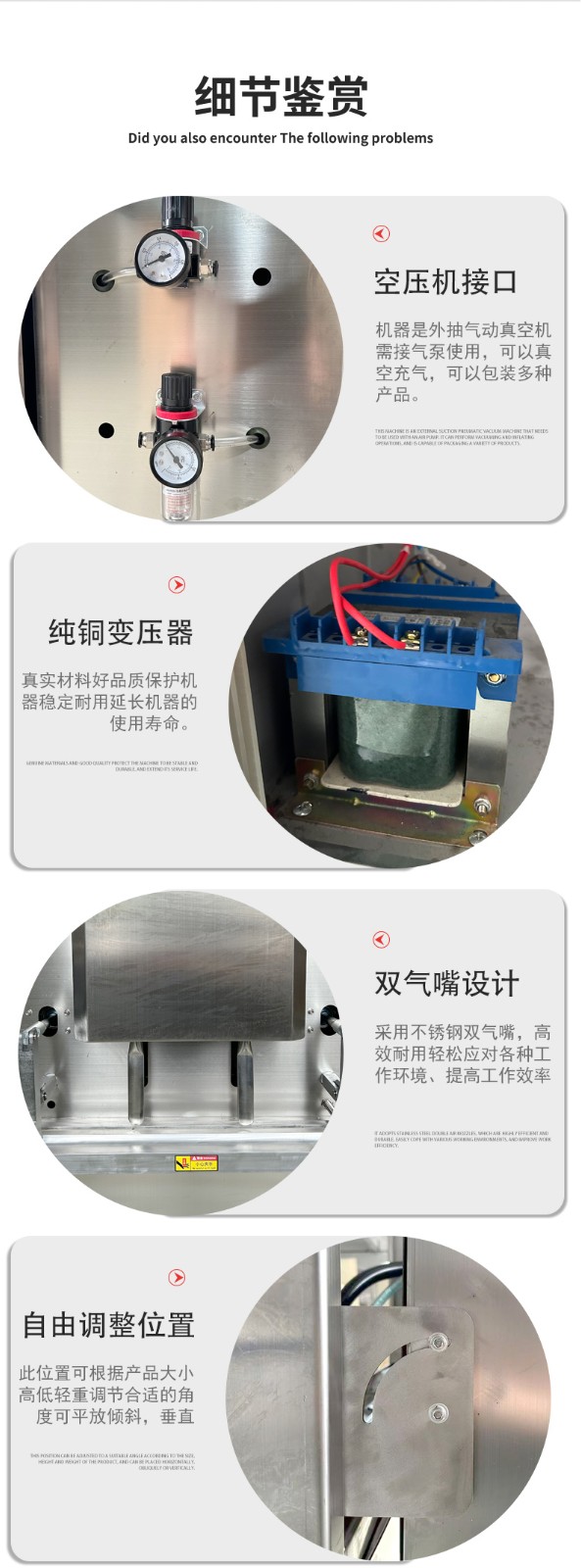 • 五金機(jī)械:小型機(jī)械零件(如軸承、齒輪組)、異形金屬工具,可根據(jù)零件高度調(diào)整工作臺(tái),避免包裝時(shí)變形。