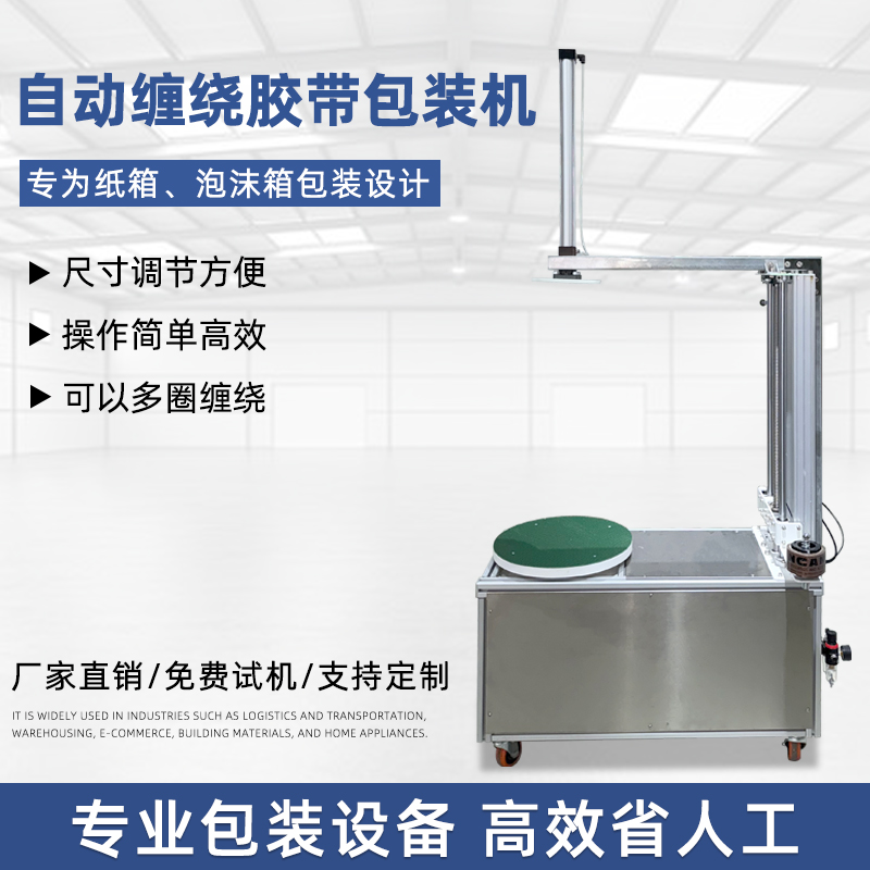 - 貨物纏繞機(jī):主要用于托盤貨物、大型設(shè)備等的包裝,通過旋轉(zhuǎn)工作臺(tái)帶動(dòng)貨物旋轉(zhuǎn),同時(shí)膠帶從上方或側(cè)面進(jìn)行纏繞,如常見的物流倉儲(chǔ)用膠帶纏繞機(jī)。