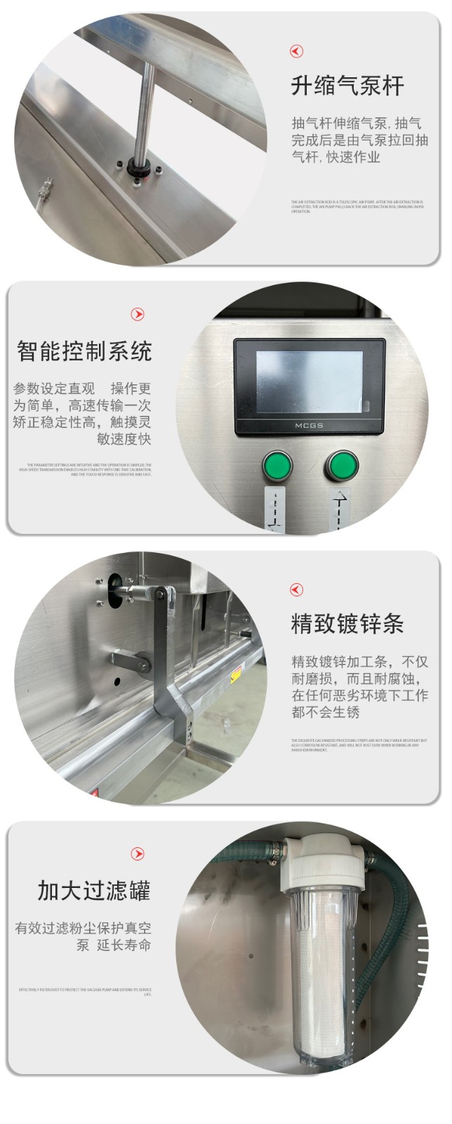 • 真空與充氣一體:多數(shù)立式升降真空包裝機(jī)兼具真空和充氣功能,抽完真空后,可往包裝袋內(nèi)充入氮?dú)?、二氧化碳等惰性氣體,適合食品保鮮等。