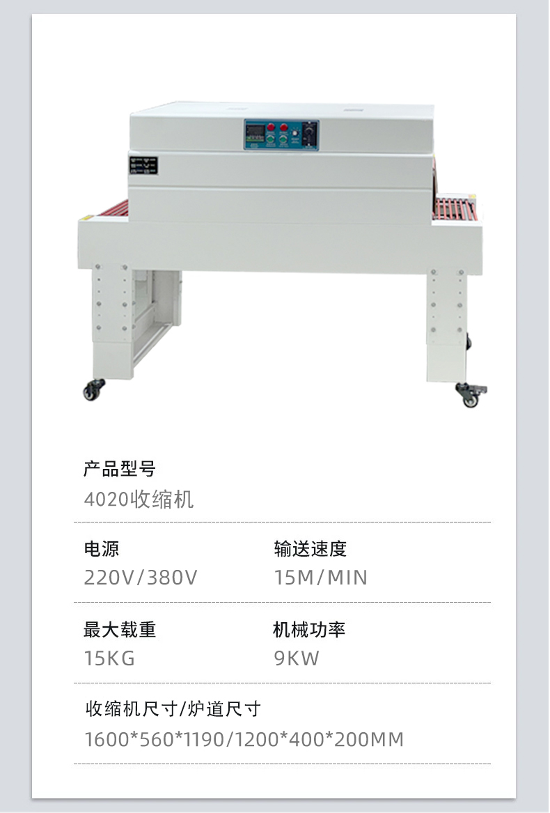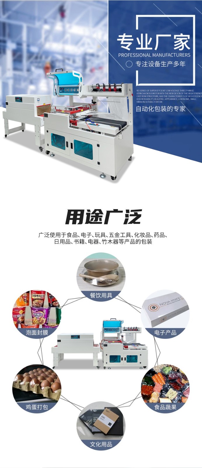 廣泛應(yīng)用于食品、化妝品、醫(yī)藥、印刷品、飲料、五金塑料等行業(yè),適用 POF、PE、PVC 等各種收縮包裝材料。