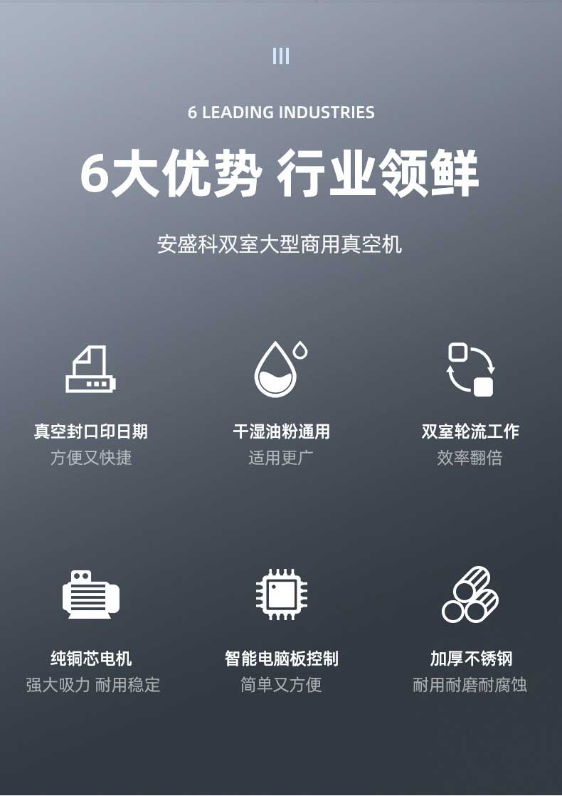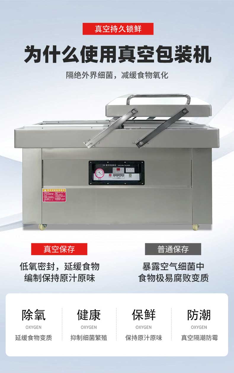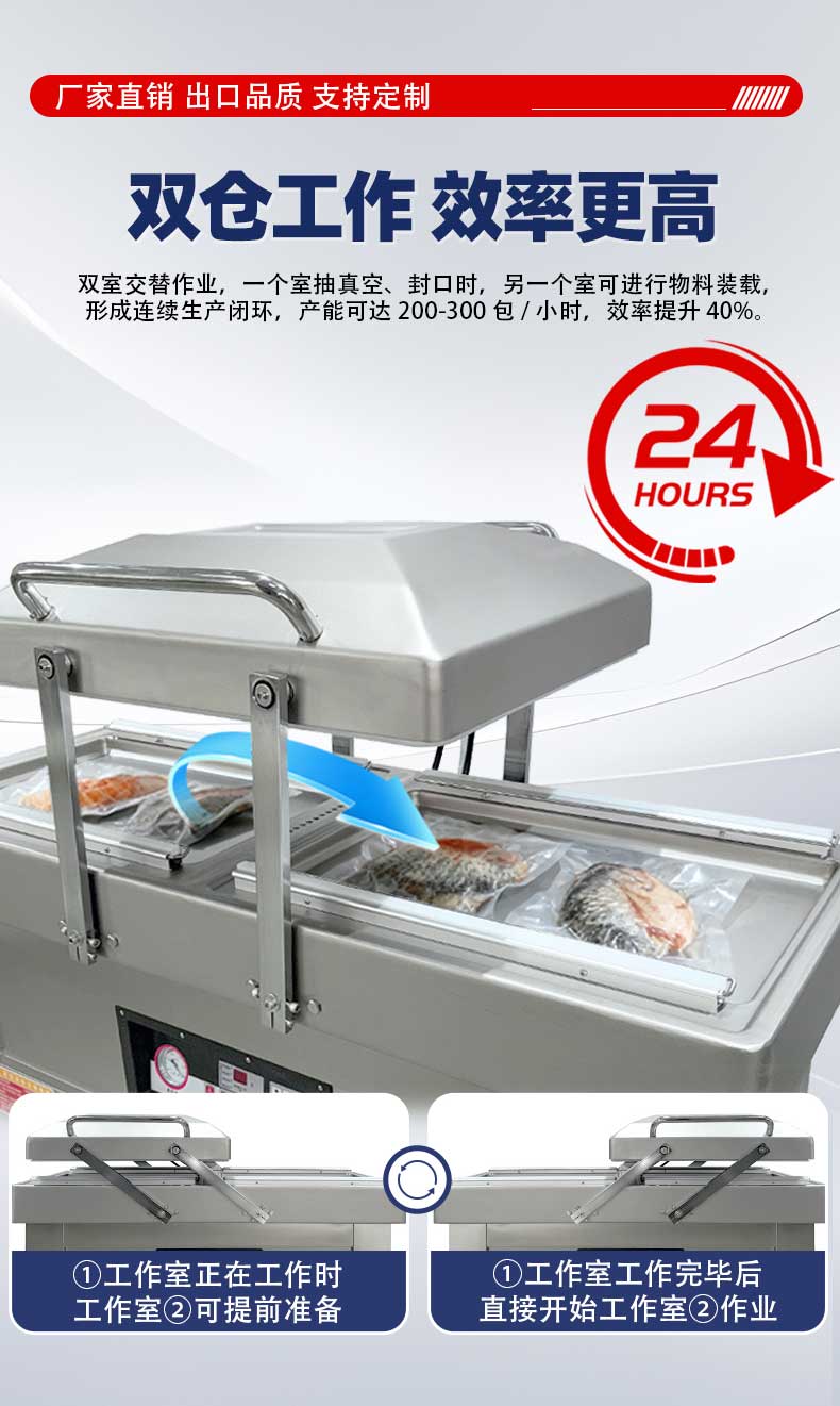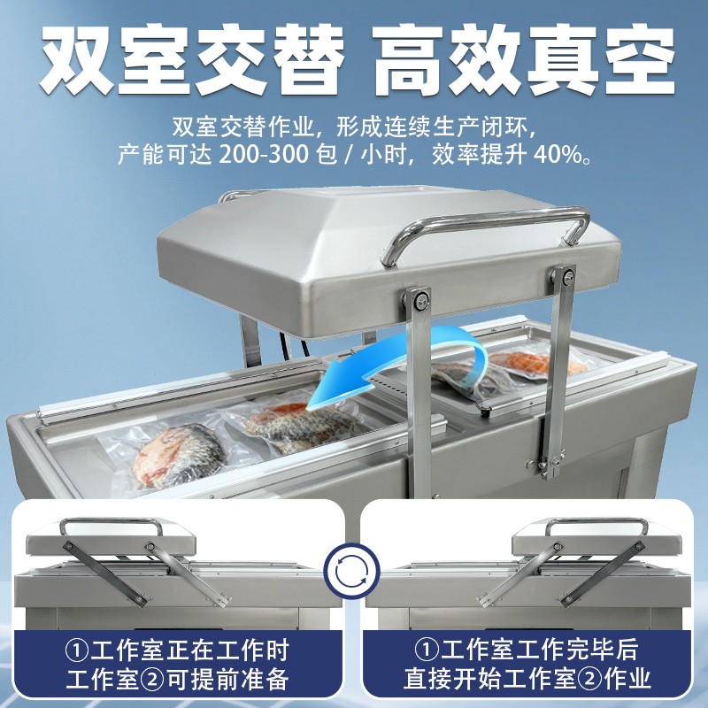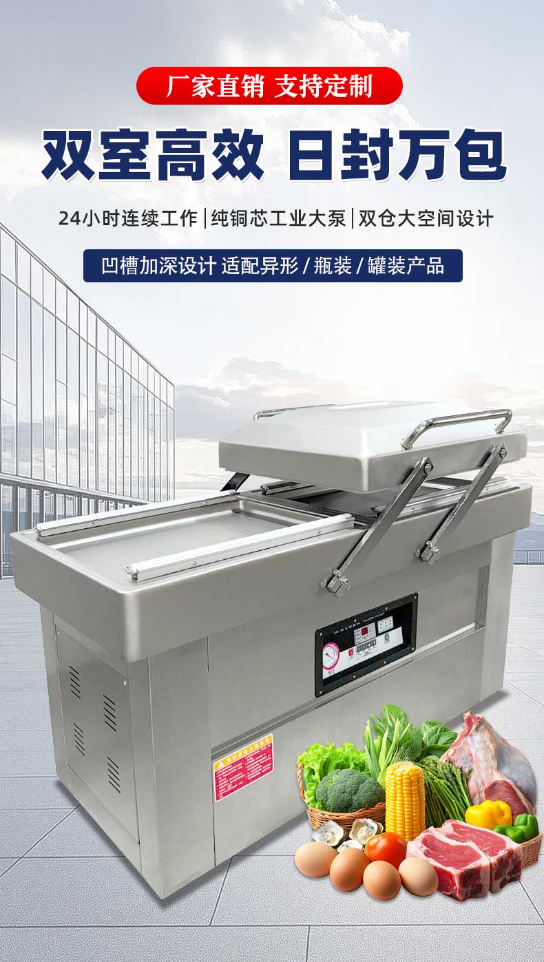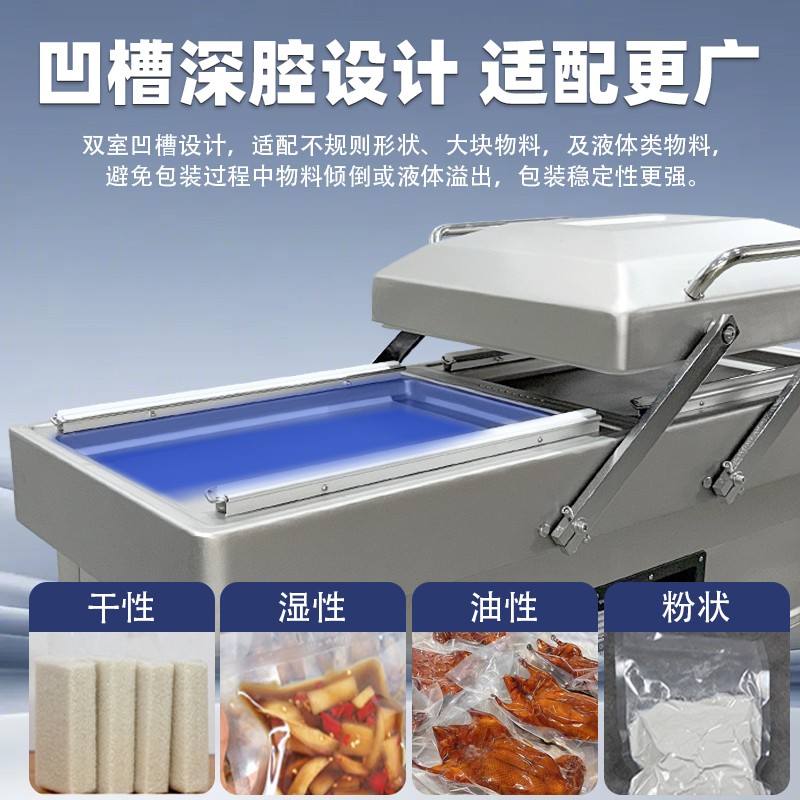 在鹵味飄香的熟食店、水產(chǎn)豐富的漁港作坊、預(yù)制菜量產(chǎn)的食品工廠中,帶湯汁、高水分產(chǎn)品的包裝始終是行業(yè)痛點——傳統(tǒng)真空機易漏液、效率低、保鮮差的問題,往往導(dǎo)致食材損耗、客訴頻發(fā)。雙室凹槽真空機專為這類產(chǎn)品量身打造,以“防漏鎖鮮+高效量產(chǎn)”為核心,通過結(jié)構(gòu)創(chuàng)新與技術(shù)升級,成為鹵味、水產(chǎn)、預(yù)制菜行業(yè)的包裝利器。針對鹵味鹵汁、水產(chǎn)冰衣、預(yù)制菜湯汁等特殊屬性,設(shè)備在真空系統(tǒng)、密封結(jié)構(gòu)、操作邏輯上實現(xiàn)全維度優(yōu)化,從源頭規(guī)避包裝風(fēng)險。