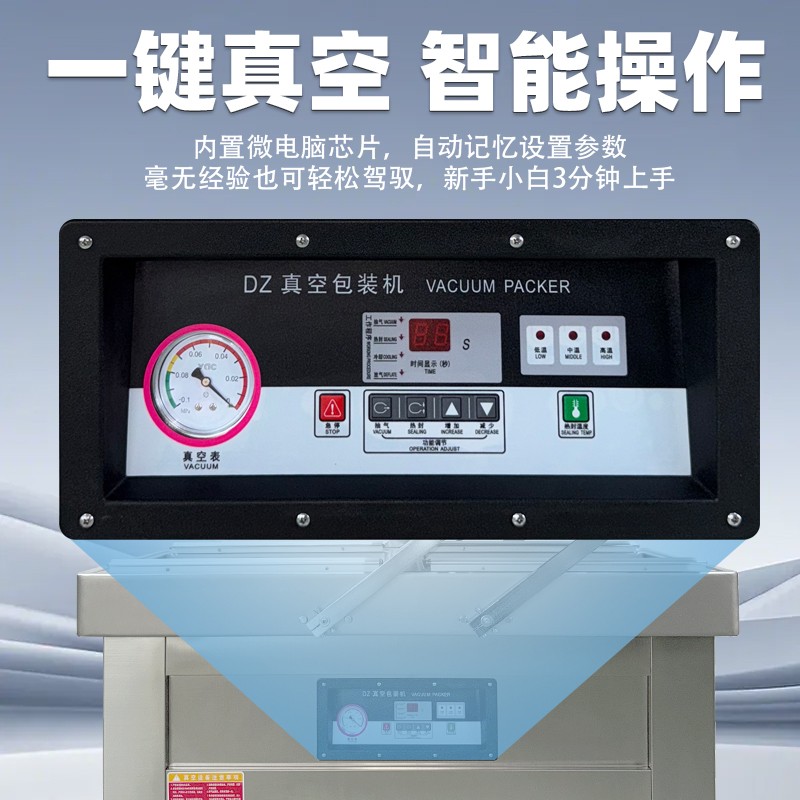 操作上采用全智能控制面板,可預(yù)設(shè)抽真空時間、真空度、封口溫度等10組常用參數(shù),新手只需一鍵啟動。