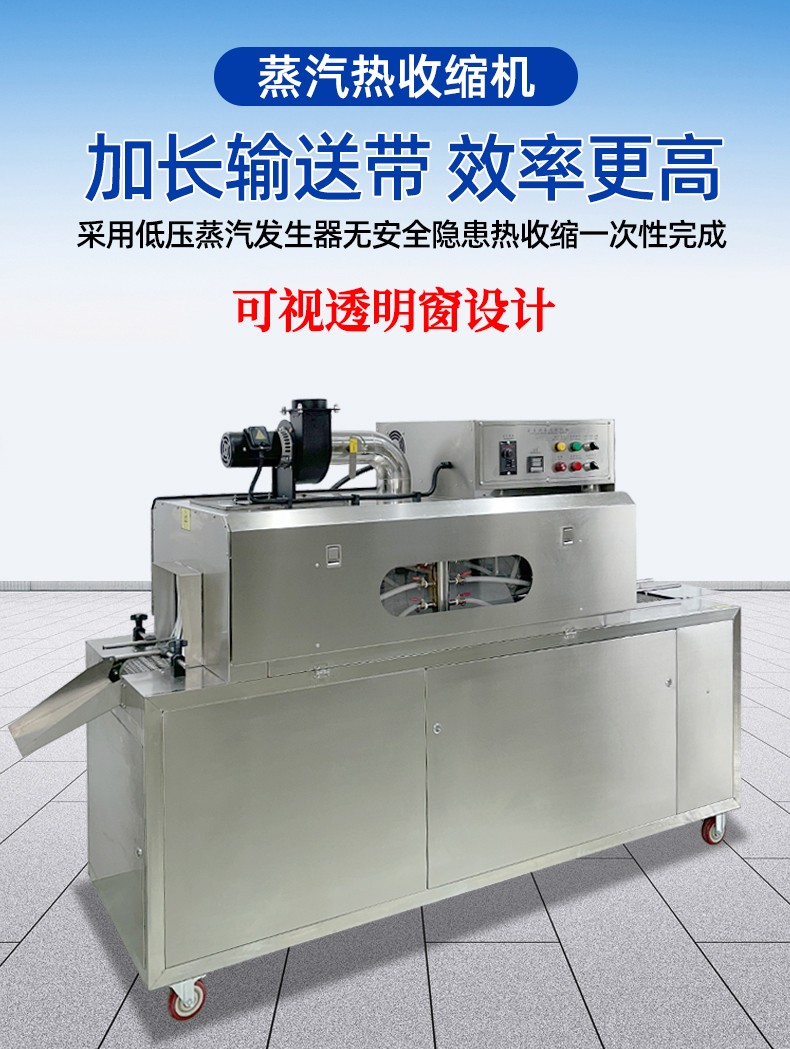 1. 減少設備占用空間,適配多場景布局需求傳統(tǒng)蒸汽收縮包裝方案中,獨立蒸汽發(fā)生器體積較大,需與收縮機分開放置,還需預留管道連接的空間,整體占地面積大,對廠房面積較小的中小企業(yè)或生產線布局緊湊的場景極不友好。而蒸汽收縮一體機通過結構優(yōu)化,將蒸汽發(fā)生模塊內嵌于設備主機框架內,采用垂直分層或側置內嵌的緊湊設計,整體占地面積相比 “分體式設備組合” 減少 30%-50%。這種集成化設計不僅能輕松適配車間狹窄區(qū)域、流水線嵌入式工位,還可靈活移動至臨時包裝作業(yè)區(qū),無論是固定生產線還是臨時加工點,都能高效利用有限空間。