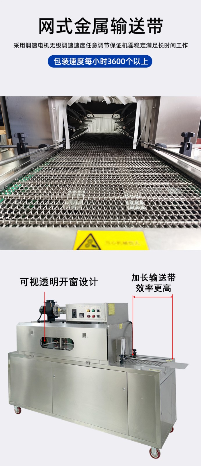 • 輸送系統(tǒng):用于將待包裝的產品輸送到蒸汽收縮區(qū)域,常見的有輸送帶、輸送鏈條等,材質多為不銹鋼或其他耐高溫、耐腐蝕材料。