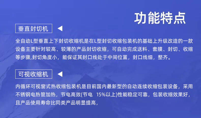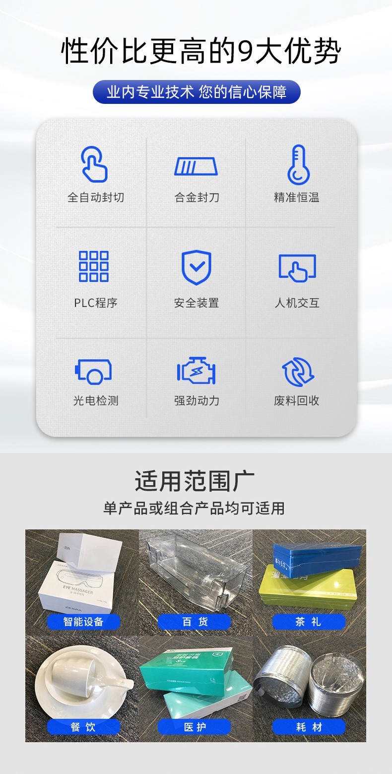 適合規(guī)則 / 不規(guī)則盒裝、瓶裝、禮盒裝產(chǎn)品(如食品禮盒、醫(yī)藥盒、日化套裝),尤其適配批量≥300 件 / 小時的生產(chǎn)線,相比 L 型封切機更適合易折皺、需精準封口的產(chǎn)品。