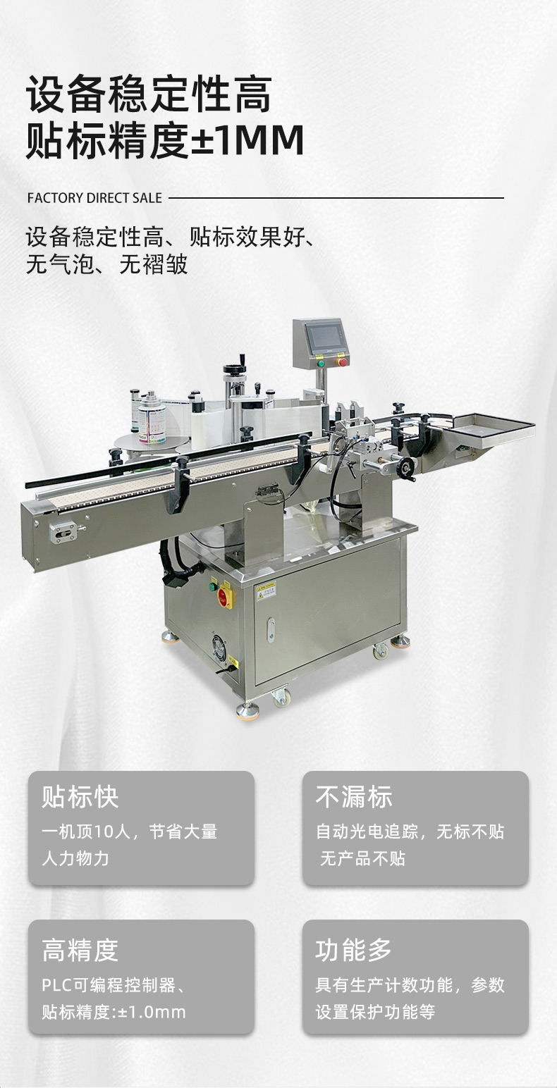 圓瓶類產(chǎn)品的貼標(biāo),可貼單標(biāo)和雙標(biāo),正背雙標(biāo)間距可靈活調(diào)整,部分機(jī)型還具備錐形瓶貼標(biāo)功能。精準(zhǔn)定位、高效智能、靈活兼容與合規(guī)耐用,可顯著提升產(chǎn)線自動(dòng)化與貼標(biāo)良率。