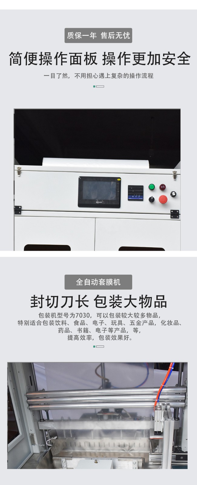 - 套膜精度高:通過精密的機械結(jié)構(gòu)和先進的控制系統(tǒng),能夠精確地將薄膜套在產(chǎn)品上。薄膜的包裹位置、松緊度等都能得到精準控制,確保每個產(chǎn)品的套膜質(zhì)量一致,包裝外觀整齊、美觀。這種精準性對于提升產(chǎn)品形象和品牌價值非常有幫助。