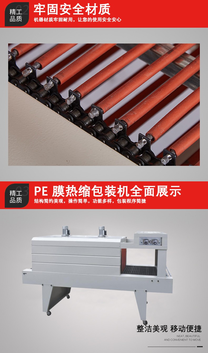 • 主要包括輸送帶和驅(qū)動(dòng)電機(jī)。輸送帶用于承載并輸送被 PE 薄膜包裹的產(chǎn)品通過(guò)加熱區(qū)域。驅(qū)動(dòng)電機(jī)控制輸送帶的速度,這個(gè)速度是可以調(diào)節(jié)的。其重要性在于確保產(chǎn)品在加熱區(qū)域停留足夠的時(shí)間,讓 PE 薄膜充分收縮。例如,如果輸送帶速度太快,PE 薄膜可能來(lái)不及完全收縮就離開了加熱區(qū)域,導(dǎo)致包裝質(zhì)量不佳;如果速度太慢,又會(huì)影響包裝效率。