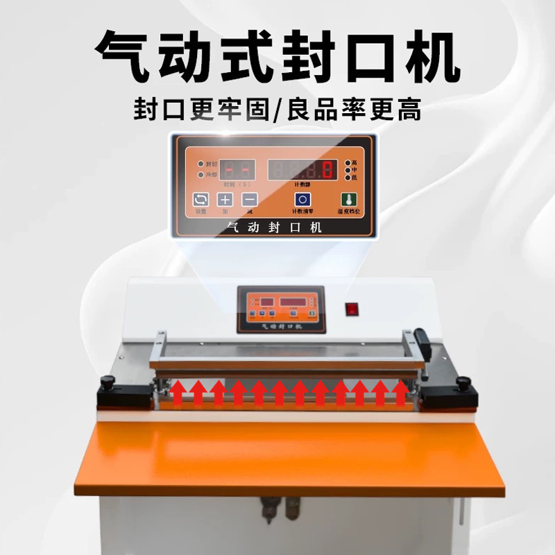 - 封口原理:通過(guò)氣動(dòng)裝置產(chǎn)生壓力,將待包裝物品的塑料薄膜袋口部位壓緊,然后利用加熱元件對(duì)袋口進(jìn)行加熱,使薄膜受熱熔化,在壓力作用下實(shí)現(xiàn)封口。