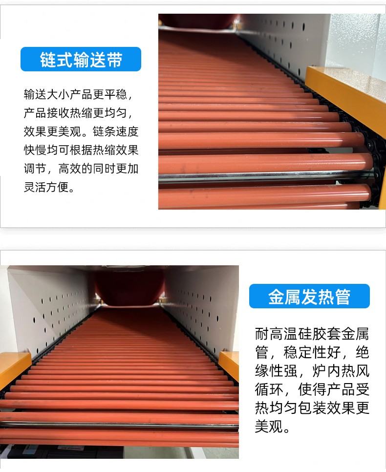 - 熱收縮效果佳:熱收縮通道內(nèi)的溫度分布均勻,熱風(fēng)循環(huán)系統(tǒng)設(shè)計(jì)合理,可使塑料薄膜均勻收縮,緊密貼合產(chǎn)品,展現(xiàn)產(chǎn)品的外觀特征,同時(shí)起到防潮、防塵、防碰撞等保護(hù)作用。