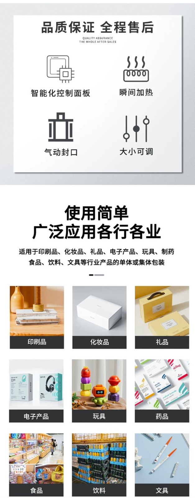 - 電子行業(yè):電子元器件、小型電子產(chǎn)品如手機(jī)、耳機(jī)、充電器等,需要防潮、防靜電的包裝環(huán)境。該設(shè)備可使用防靜電塑料薄膜對(duì)電子產(chǎn)品進(jìn)行包裝,在保護(hù)產(chǎn)品的同時(shí),提供良好的外觀展示