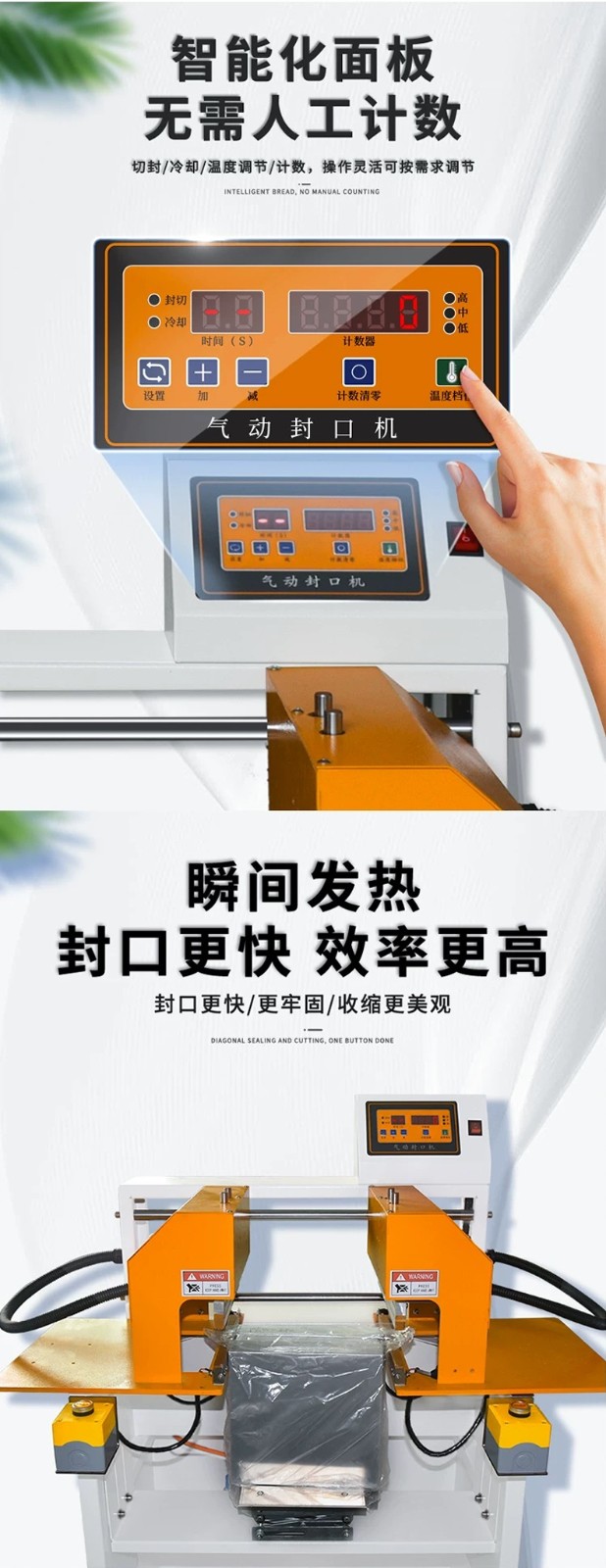 - 封口質(zhì)量好:通過(guò)精確控制氣動(dòng)壓力和加熱溫度、時(shí)間,能夠保證封口處的薄膜熔接牢固、平整,封口強(qiáng)度高,不易出現(xiàn)漏包現(xiàn)象。
