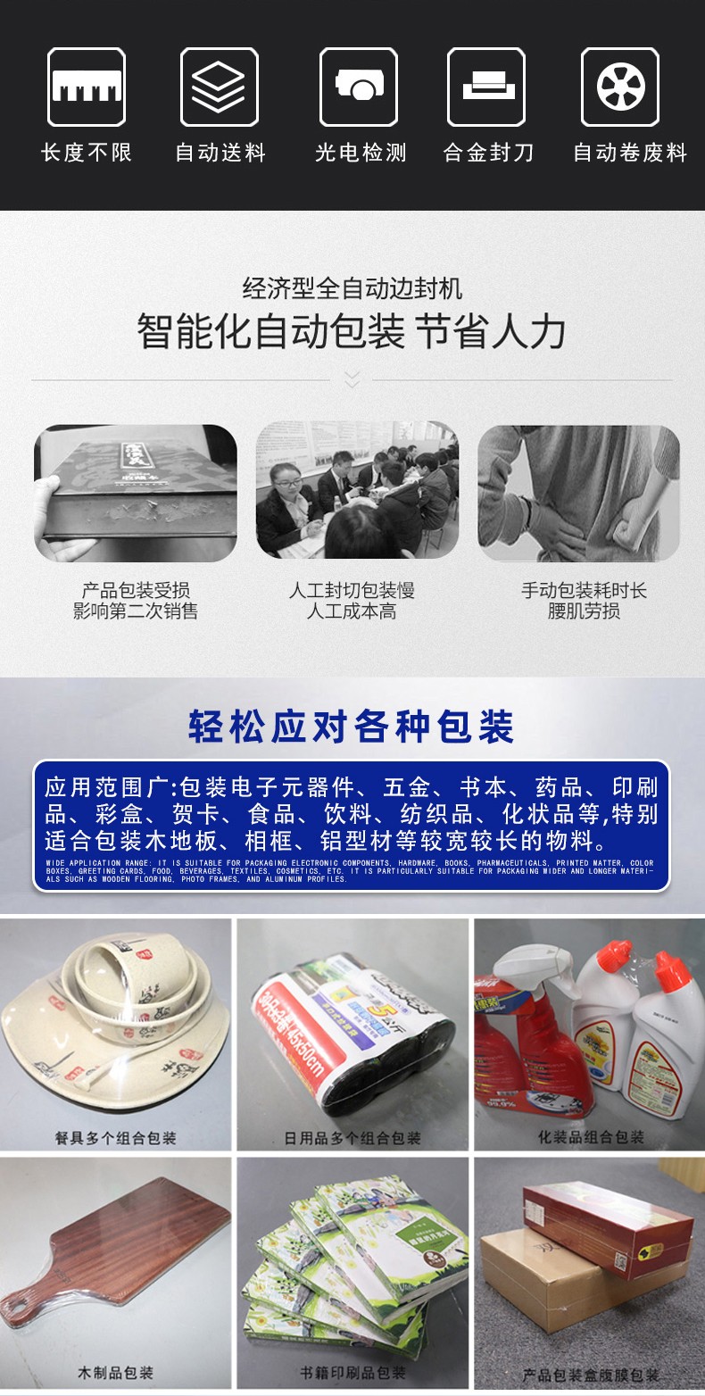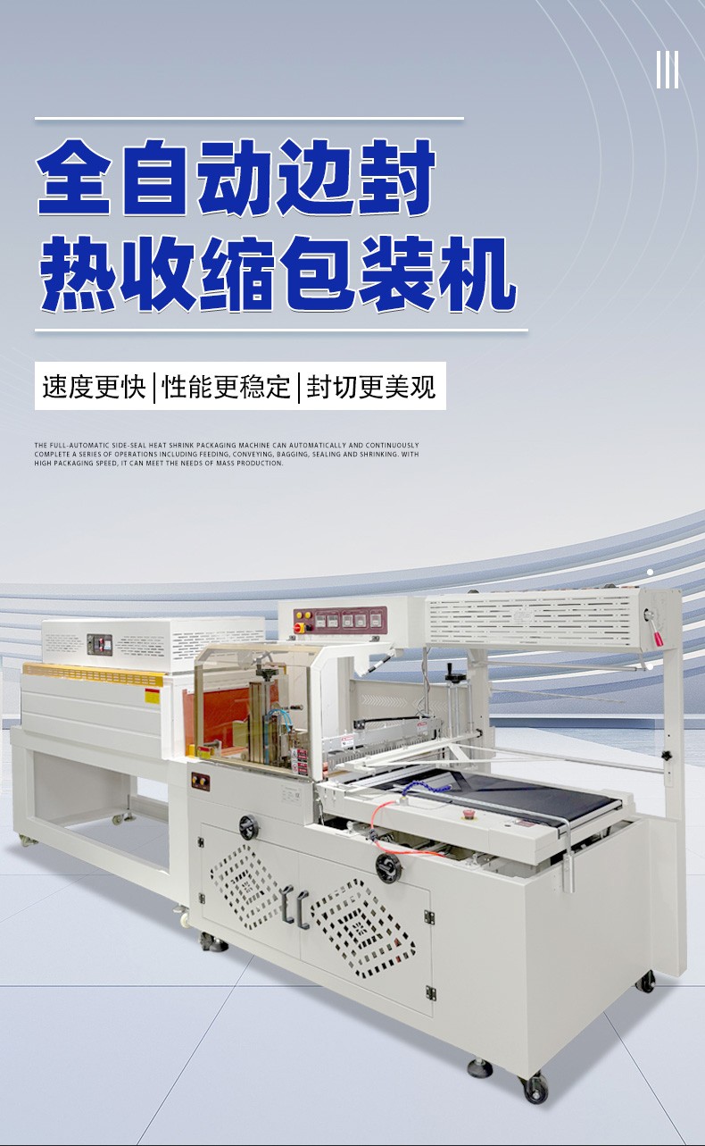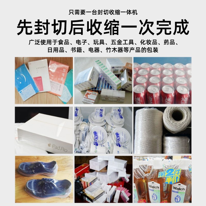 - 適用范圍廣4:邊封設(shè)計(jì)的包裝機(jī)可包裝長(zhǎng)度不限的產(chǎn)品,通過(guò)調(diào)整還能適應(yīng)不同寬度、高度的產(chǎn)品包裝,可用于 POF、PVC 等多種熱收縮膜,能滿足食品、電子、醫(yī)藥、日化等多個(gè)行業(yè)的包裝需求。
