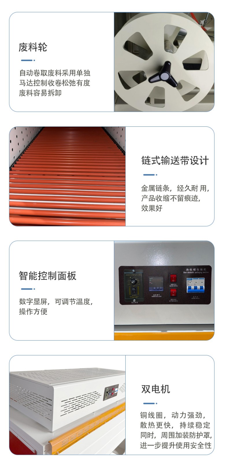 - 結(jié)構(gòu)組成:一般由封切裝置、熱收縮爐、輸送系統(tǒng)、送膜機(jī)構(gòu)和控制系統(tǒng)等組成。封切裝置用于對(duì)膜進(jìn)行封口和切斷;熱收縮爐提供熱量使膜收縮;輸送系統(tǒng)負(fù)責(zé)傳送產(chǎn)品和包裝好的物品;送膜機(jī)構(gòu)實(shí)現(xiàn)膜的輸送和定位;控制系統(tǒng)則用于設(shè)定和控制各部分的運(yùn)行參數(shù)。