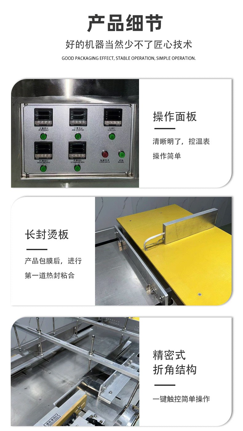 - 折邊定型:封切后的產(chǎn)品進(jìn)入折邊工位,預(yù)熱裝置先對產(chǎn)品兩端的多余膜料進(jìn)行軟化(便于塑形),再通過機械折邊機構(gòu)(側(cè)折板、端折板)將膜料折疊、壓合,使包裝邊緣平整緊致,最終形成與產(chǎn)品形狀完全匹配的立體包裝;