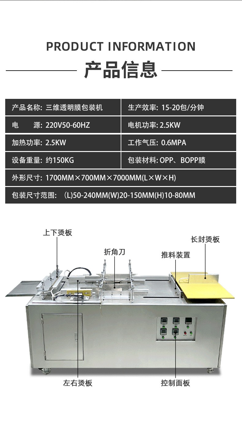 半自動三維包裝機(又稱半自動透明膜裹包機、半自動煙包機)是醫(yī)藥、食品、日化、電子等行業(yè)中用于提升產(chǎn)品包裝檔次的核心設(shè)備,其核心是通過 BOPP 透明膜(或含鋁箔的復(fù)合膜)對產(chǎn)品進(jìn)行三維立體裹包,形成類似香煙盒外層的緊致、透明(或半透明)包裝,兼具防塵、防潮、防偽及外觀美化功能。其 “半自動” 特性主要體現(xiàn)在需人工輔助上料,后續(xù)核心包裝工序全自動完成,平衡了設(shè)備成本與包裝效率,適合中小批量或多規(guī)格產(chǎn)品的包裝需求。