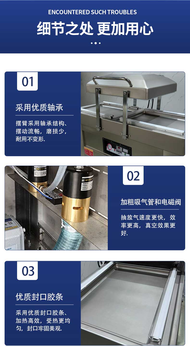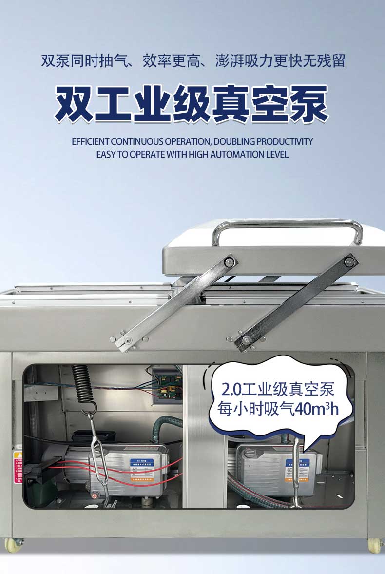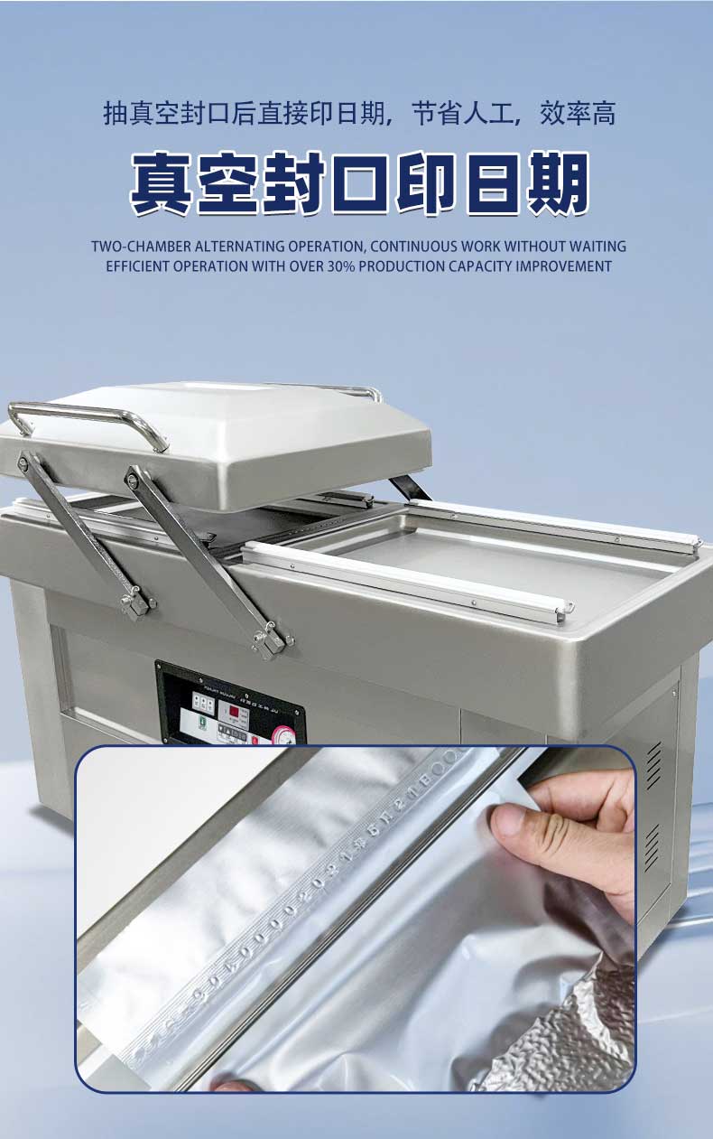 - 雙室設(shè)計(jì):一個(gè)真空室在抽真空時(shí),另一個(gè)真空室可以擺放包裝物,交替工作,節(jié)省操作時(shí)間,提高包裝效率。