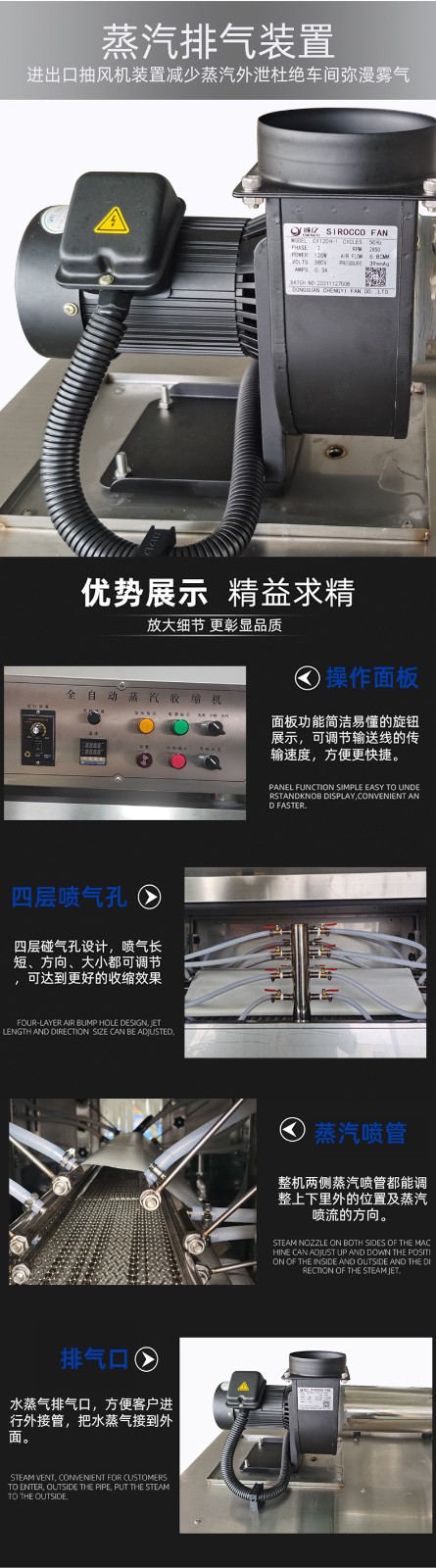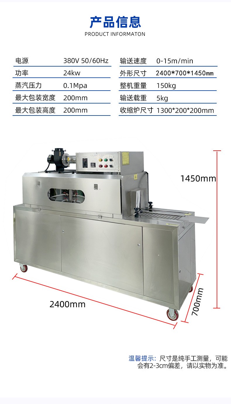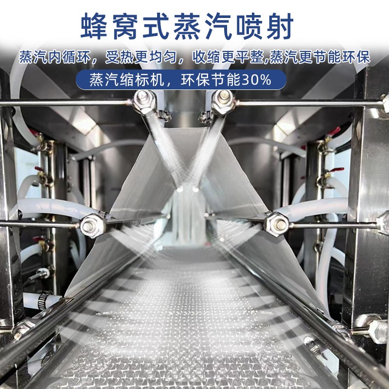 配備 PLC 智能控制系統(tǒng),可精準(zhǔn)調(diào)節(jié)蒸汽溫度(50℃-120℃可調(diào))、輸送速度與蒸汽噴射量,兼容 POF、PVC、PE 等多種熱收縮膜材,滿足不同產(chǎn)品的包裝厚度與質(zhì)感要求。